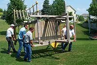 After coordination efforts through CPI, the date to move the play set was set. The crew assembled at Dr. Evans' home to begin the task. The play set was partially disassembled, carried to the flat bed in large pieces and began the journey to Seasons Hospice. Within an hour, the play set was reassembled in its new location, set in the shade with a view of the pond. A picnic table, also donated by the Evans family, completed the play area. The positive attitude and willingness of the volunteers to make this endeavor a success overcame the heat and humidity of the day.