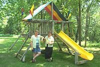 After coordination efforts through CPI, the date to move the play set was set. The crew assembled at Dr. Evans' home to begin the task. The play set was partially disassembled, carried to the flat bed in large pieces and began the journey to Seasons Hospice. Within an hour, the play set was reassembled in its new location, set in the shade with a view of the pond. A picnic table, also donated by the Evans family, completed the play area. The positive attitude and willingness of the volunteers to make this endeavor a success overcame the heat and humidity of the day.